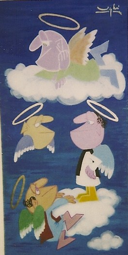Quadri: miscellaneaRiportiamo in questa sezione una panoramica degli altri temi trattati da Vighi nella sua attività di pittore. Le sue prime opere pittoriche conservano un contenuto satirico-umoristico chiaramente derivato dalla sua lunga militanza come vignettista. Ed ecco quindi la serie delle 'Nature morte', realizzata verso la seconda metà degli anni '70, con evidente garbato intento satirico nei confronti di un famoso pittore suo conterraneo (vedi galleria delle immagini), e quella successiva sull'Arte Sacra (vedi pagina). Nelle sue opere più significative degli anni '80 e '90 (Inferni Urbani e Humouresque - vedi pagine), vi è però un chiaro distacco dai contenuti satirici a favore di ben altre suggestioni. Le opere della serie 'Angioletti' (anni '80) appaiono come un innocente 'divertissement' (vedi galleria delle immagini). Peraltro, per la loro delicatezza, sono state molto apprezzate, tant'è che ne è rimasta solo una documentazione fotografica. Nell'immagine grande un quadro del 2001 riconducibile alle serie dedicate alle carte da gioco e denominate 'Re, Regine e Compagnia' o 'Giochi di carte': Vighi era, un po' curiosamente, affascinato dalle figure delle carte da gioco e ne ha tratto tele molto particolari il cui significato recondito è ancora da studiare e approfondire. Questo tema delle carte da gioco è l'unico che Vighi ha ripreso più volte nel corso degli anni, diversamente dalle altre serie la cui realizzazione si è concentrata in anni precisi per poi cessare definitivamente. Le ultime cinque tele nella galleria delle immagini, delle quali una, molto divertente (quella con i 'pettini' di Capogrossi), già riportata e commentata nella pagina 'Inferni Urbani', sono state realizzate nel 1982 e 1983. Oltre a essere molto piacevoli per accostamento di forme e colori, esse rappresentano un primo approccio al tema dell'uomo massa, tema poi compiutamente affrontato e sviluppato da Vighi nella serie 'Inferni Urbani' (vedi pagina). |